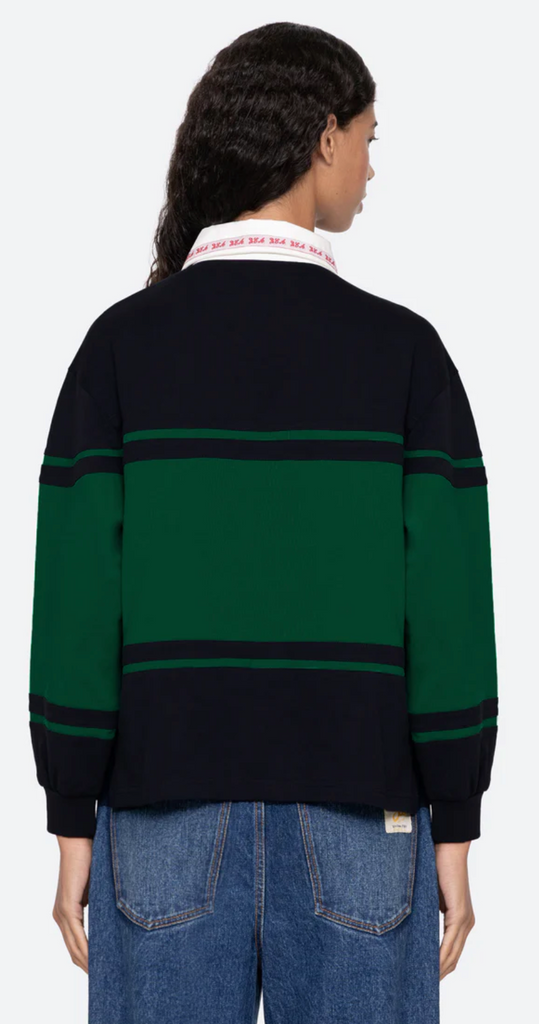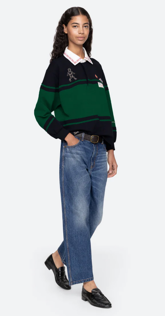 The Carolyn long sleeve rugby shirt is a workwear-inspired rugby top featuring long puff sleeves, custom Sea labels, and intricate embroidered detailing. Designed with a button-front closure, this versatile piece blends utility with feminine charm, making it a unique addition to any wardrobe.