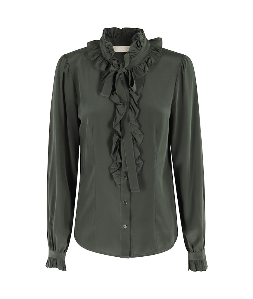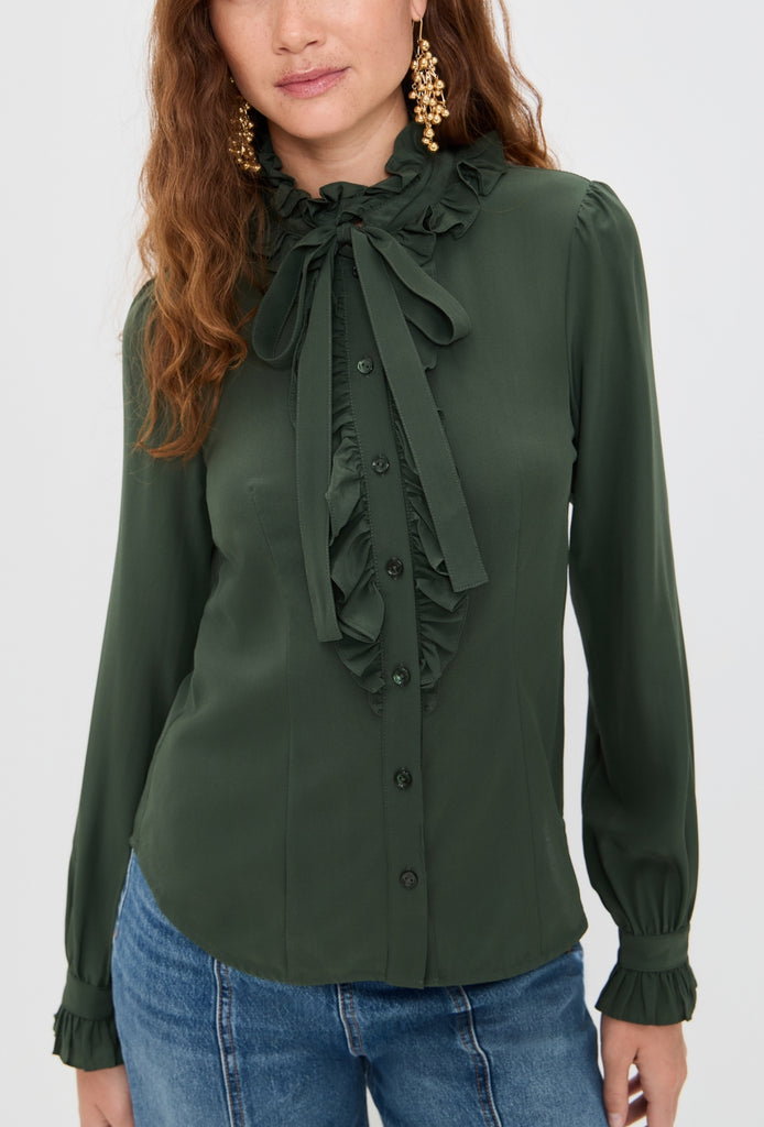 The Catroux Blouse is adorned with 19th century-inspired French florals enriched with graphic engravings. Crafted from signature silk crepe de chine, this silk top is imbued with poetic detailing, with frills at the collar and fluted cuffs.