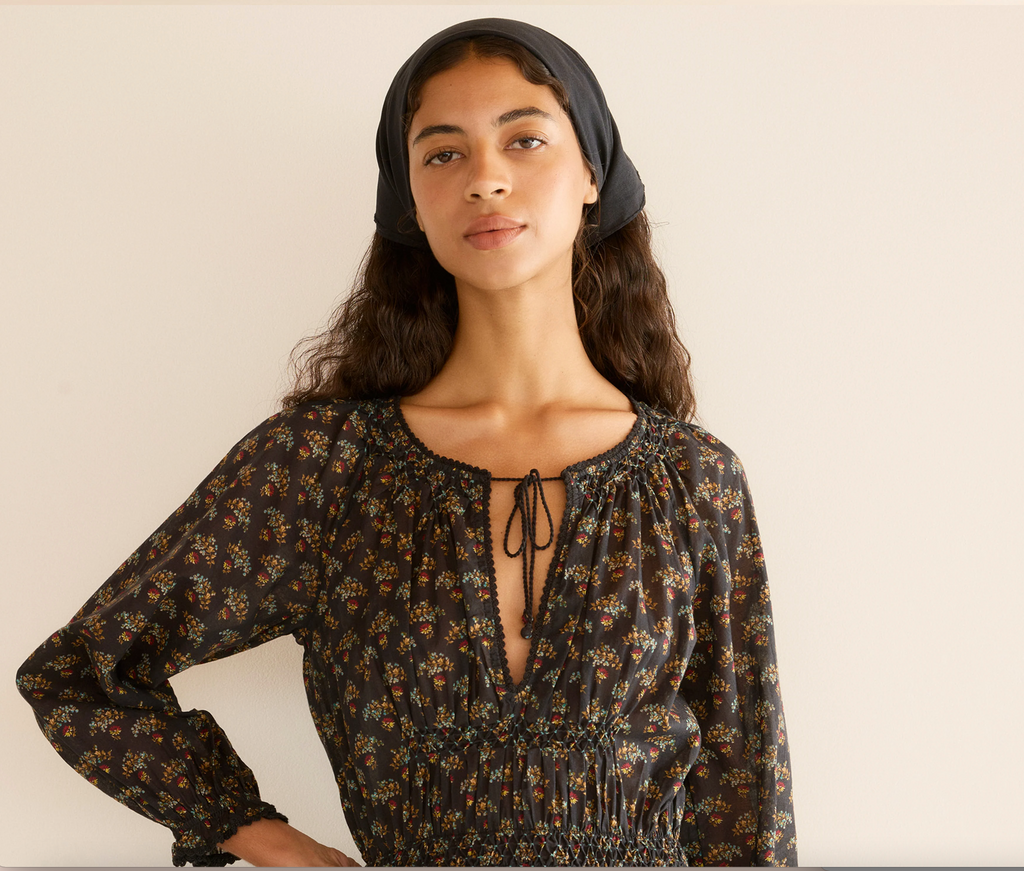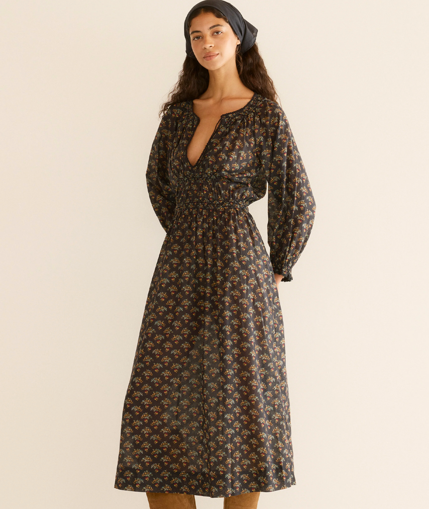 Crafted from soft, 100% organic cotton voile in our Delphinium Floral print, the ‘70s-inspired Delfina Dress features three-quarter-length raglan sleeves, hand-crocheted scallop trim at the neckline and sleeve cuffs, and delicate self-ties at the neck that finish in petite baubles. Intricate hand-smocking textures the yoke and bodice, while a fitted waist gives way to a full, ankle-grazing skirt.