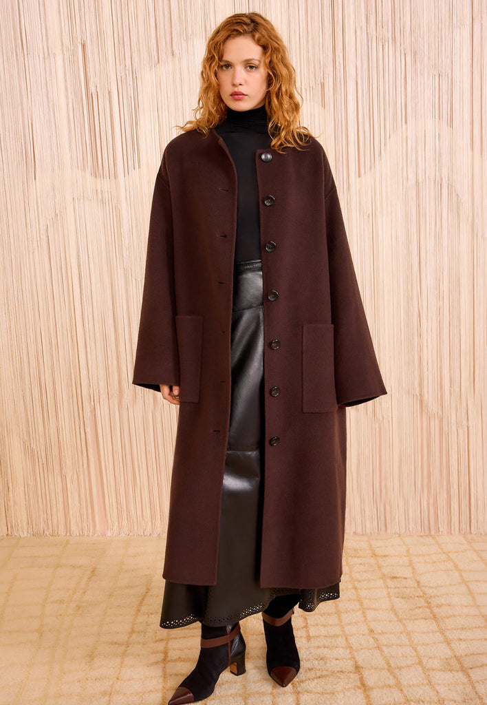 Look 35 on the AW25 runway showcases the Fernanda Coat in our signature double-faced wool and cashmere blend, arriving in a sumptuous Chocolate brown. This luxurious, single-breasted style features an elongated silhouette and a fabric belt, offering an effortless mix of versatility and comfort.