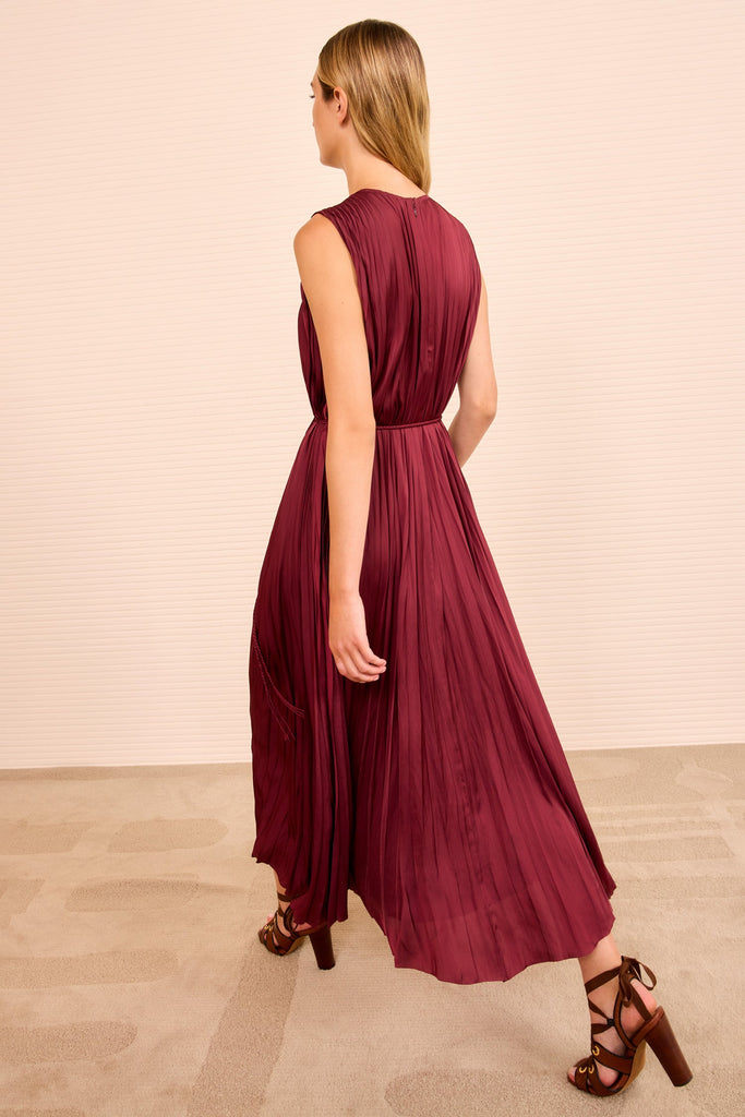 The Fianna Dress is tailored from smooth plissé satin that’s gracefully pleated throughout. Enduring in elegance, this A-line red dress can be worn fluid and loose or with the belt for more definition.