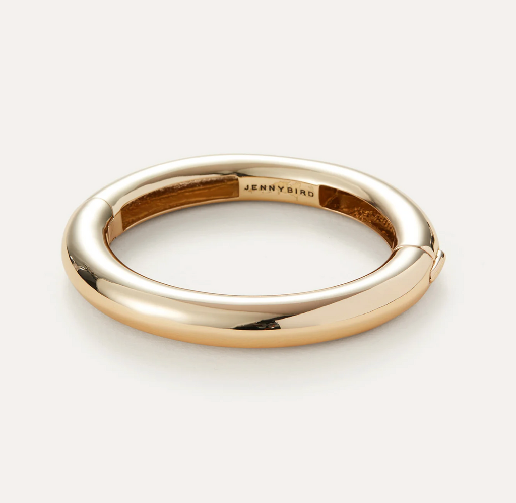 This super bold, tubular bangle will be the “white T-shirt” of your jewelry box. Wear it on its own or finish your arm stack—either way, Gia Mega is a major must-have. This thick bangle bracelet opens and closes with a hinge and tab lock closure. To open, push down on the highest point of the clasp before pulling the bangle open. To close, listen for a "click" to ensure tab is locked. Note: this design wears best when the closure is secured on the inside of your wrist, and the updated water-resistant steel ensures the design stays put. Finished in high-polish 14k gold.