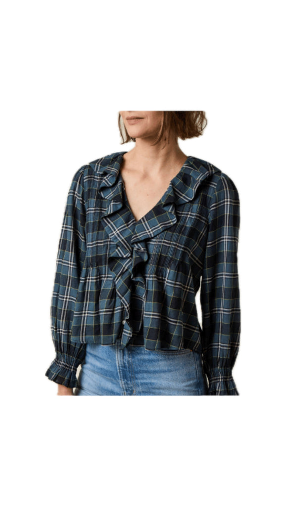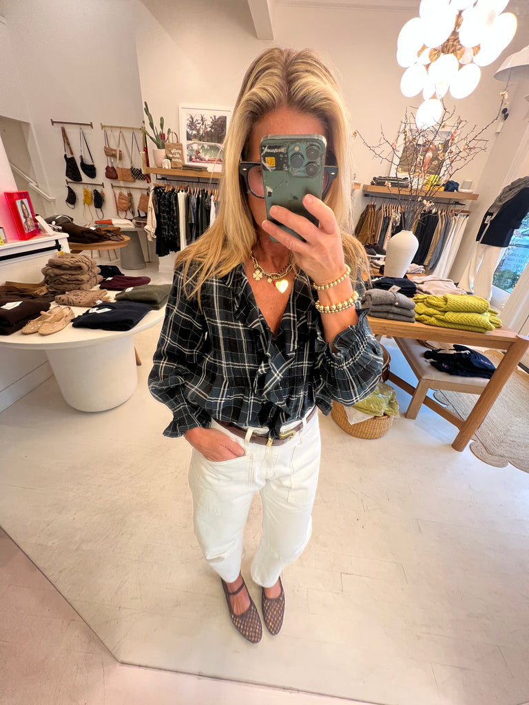 Crafted from the softest 100% organic cotton voile, the Hardy Top—a long-sleeved version of our beloved Henri Top—features a breezy cut, a plunging V-neckline framed with cascading lace-trimmed ruffles that extend down the bodice, hidden starburst buttons, and clustered pintucks at the yoke and back. Generous full-length sleeves finish in lace-trimmed ruffles at the cuffs. Wear it loose, or tuck it into your favorite high-waisted jeans, in the gorgeous Amble plaid, featuring dark green and black, its the perfect fall top!