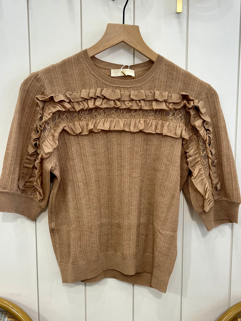 Rich in texture, The Salima is spun from Camel merino wool with a softly ribbed surface and is inlaid with lace that subtly reveals. Dancing ruffles and gently puffed sleeves finish this elevated essential.