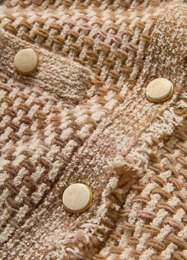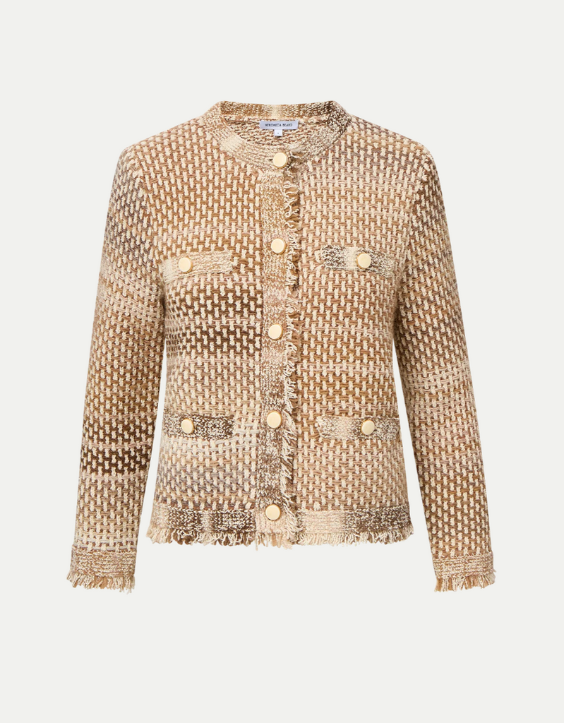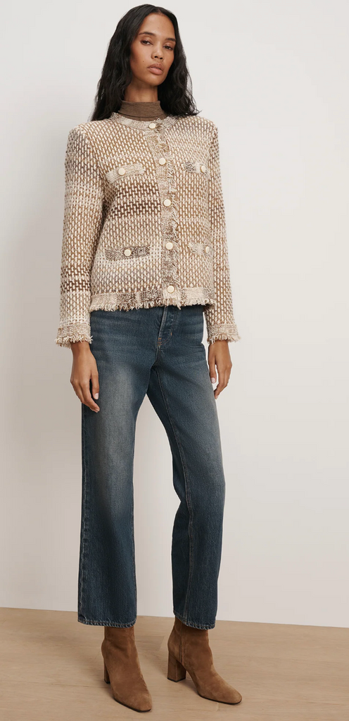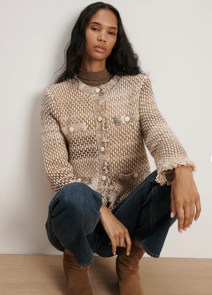 The ease of knit, the look of tweed. Spun from an Italian wool blend, the Sariyah features a relaxed, cropped fit and a chic palette of ombré rose and red. Finished with textural fringe and buttoned pockets, this collarless lady jacket pairs well with skirts and jeans alike.
