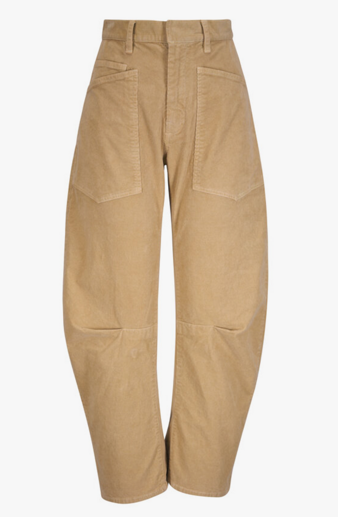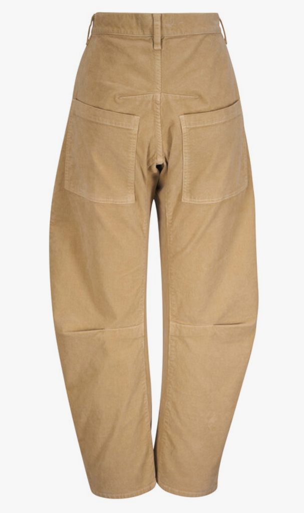 Mid-rise, relaxed fit barrel leg pant in a light corduroy. Uniquely curved silhouette. Seam detail at knees. Gusset at inseam. Zip fly. Hidden hook-and-bar closure. Hidden stay button closure. Top-stitched front and back patch pockets. Belt loops.