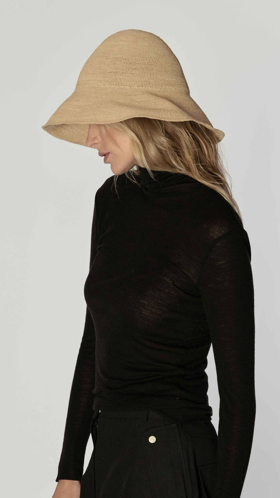 Teagan is made from straw harvested from the frond leaf in Madagascar and hand-crocheted into a light, durable fiber. Its malleable shape makes it ideal for packing with you on any journey. This raffia bucket hat provides structural design capability in the brim, allowing for any shape alterations.