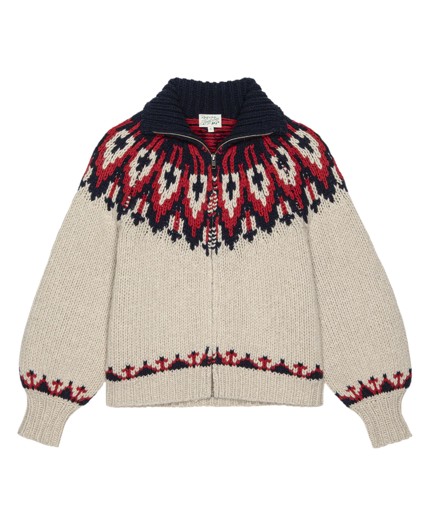Taking cues from classic nordic sweaters, this wool rich sweater features a collar that can be worn open or zipped closed for extra warmth. The slight bubble in the sleeves adds a bit of flare to a classic sweater.