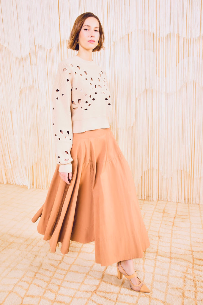 Playfully transparent, our Vanessa Pullover is ribbed from organic cotton that’s adorned with botanical eyelet embroidery drawn from a vintage Italian lace. This sweater has a classic crewneck and is a light khaki hue that easily complements your denim and tailored separates.