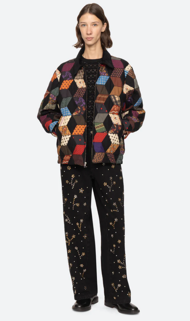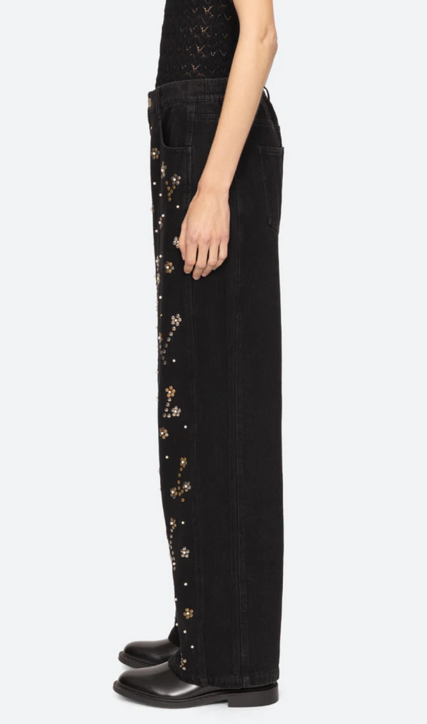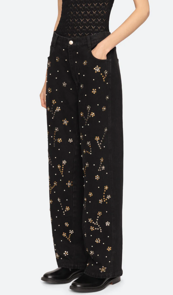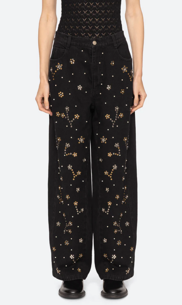 The Etta studded denim jeans are adorned with intricate pearl beading and metallic studs arranged in a bold floral pattern. This thoughtful embellishment brings texture and artistry to a classic silhouette.