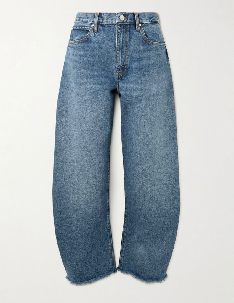 The best-selling Bubble, now with a shorter 27" inseam. The exaggerated take on the trending barrel silhouette is a unique fit and instant closet necessity. With a flattering high rise, these jeans have a curved outseam for a playful bubble effect. Note the light blue wash and raw, fringed hem for a pre-loved look.
