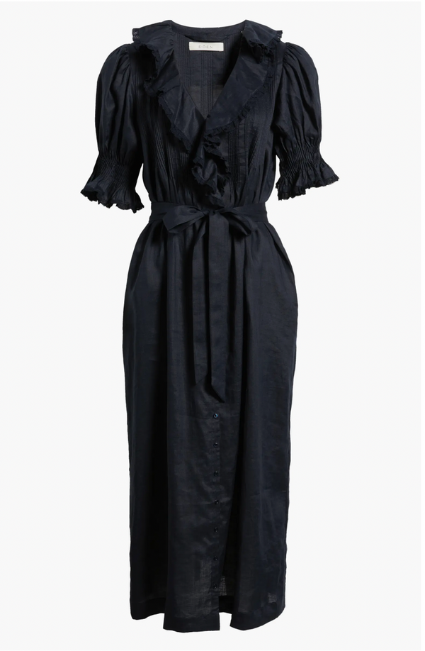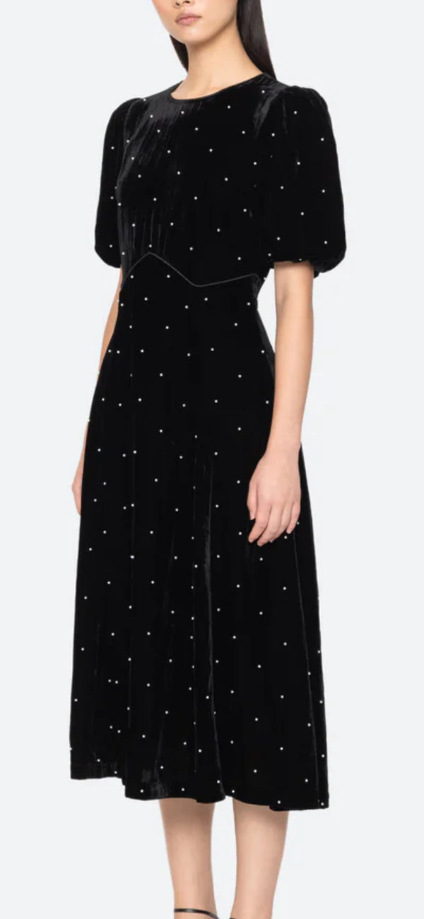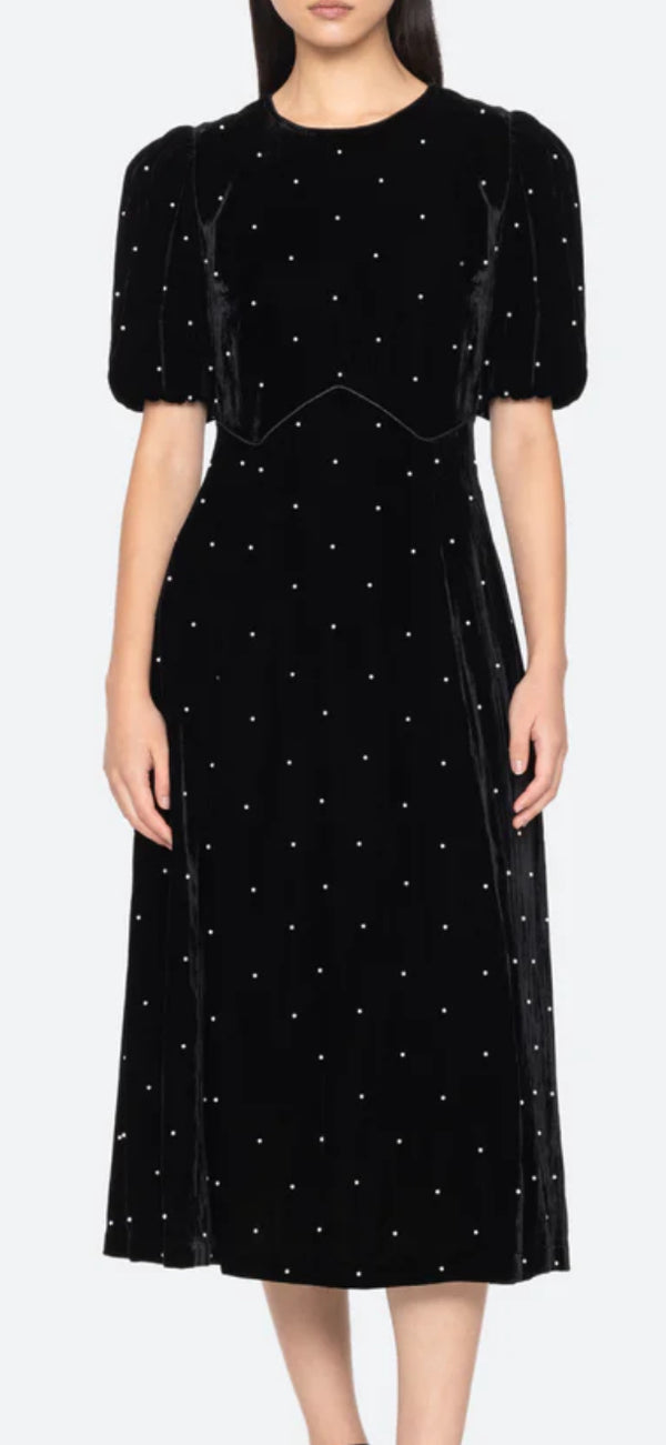CLARICE VELVET PUFF SLEEVE DRESS IN DEEP NAVY