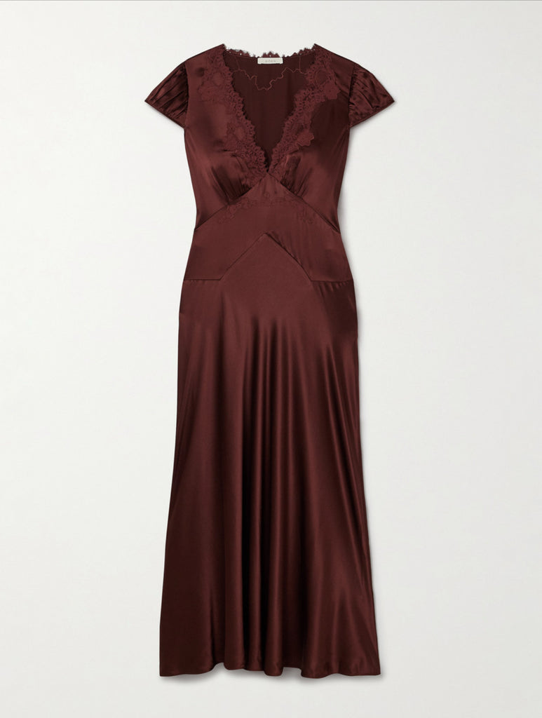 In buttery silk satin, the ‘30s-inspired Coraline Dress features gathered cap sleeves and a plunging V-neckline adorned with intricate embroidered scallop lace. A fitted bodice with an invisible side seam zipper and adjustable back waist tie gives way to a midi-length, bias-cut skirt, while an embroidered “D” at the bust adds a sweet finishing touch.