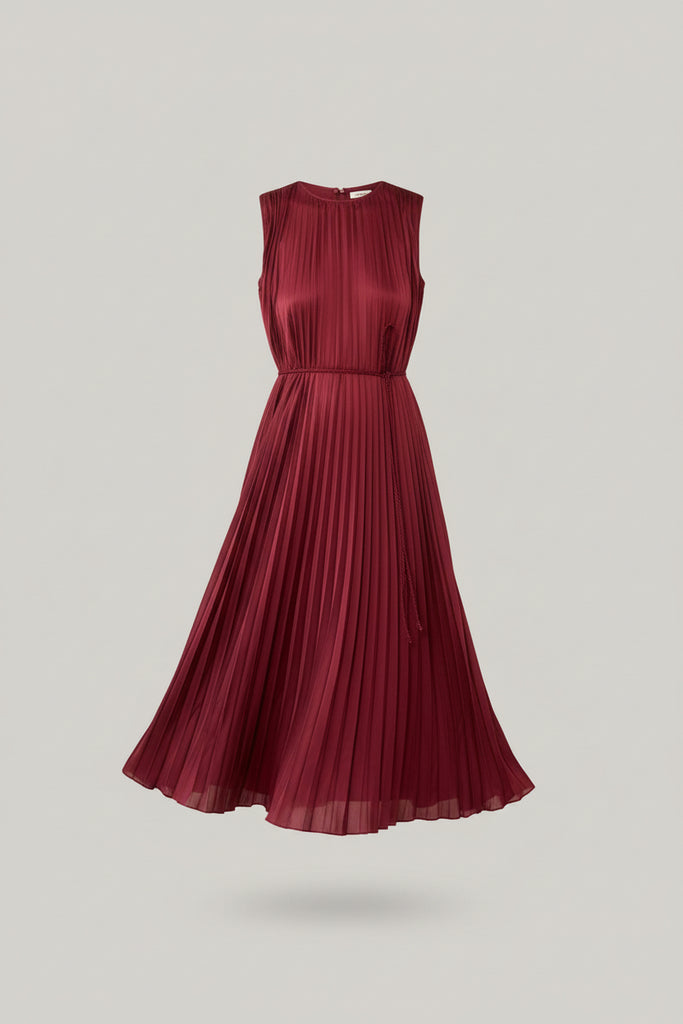 The Fianna Dress is tailored from smooth plissé satin that’s gracefully pleated throughout. Enduring in elegance, this A-line red dress can be worn fluid and loose or with the belt for more definition.