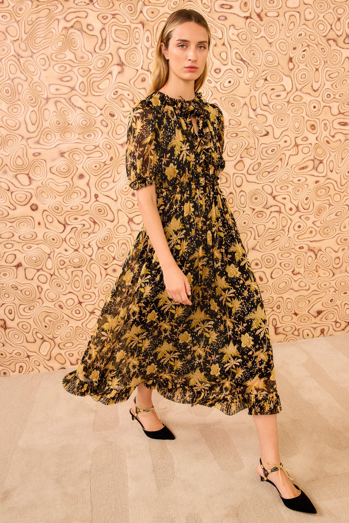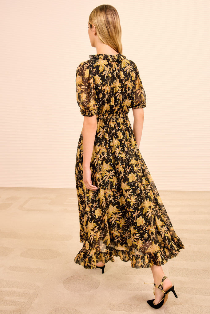 The Rosamunde Dress is crafted from lightweight chiffon rich in dialogue, featuring palm botanicals and metallic dots layered throughout. This multicolored dress features signature puffed shoulders and is finished with gestural, pleated ruffles and a handkerchief hem.