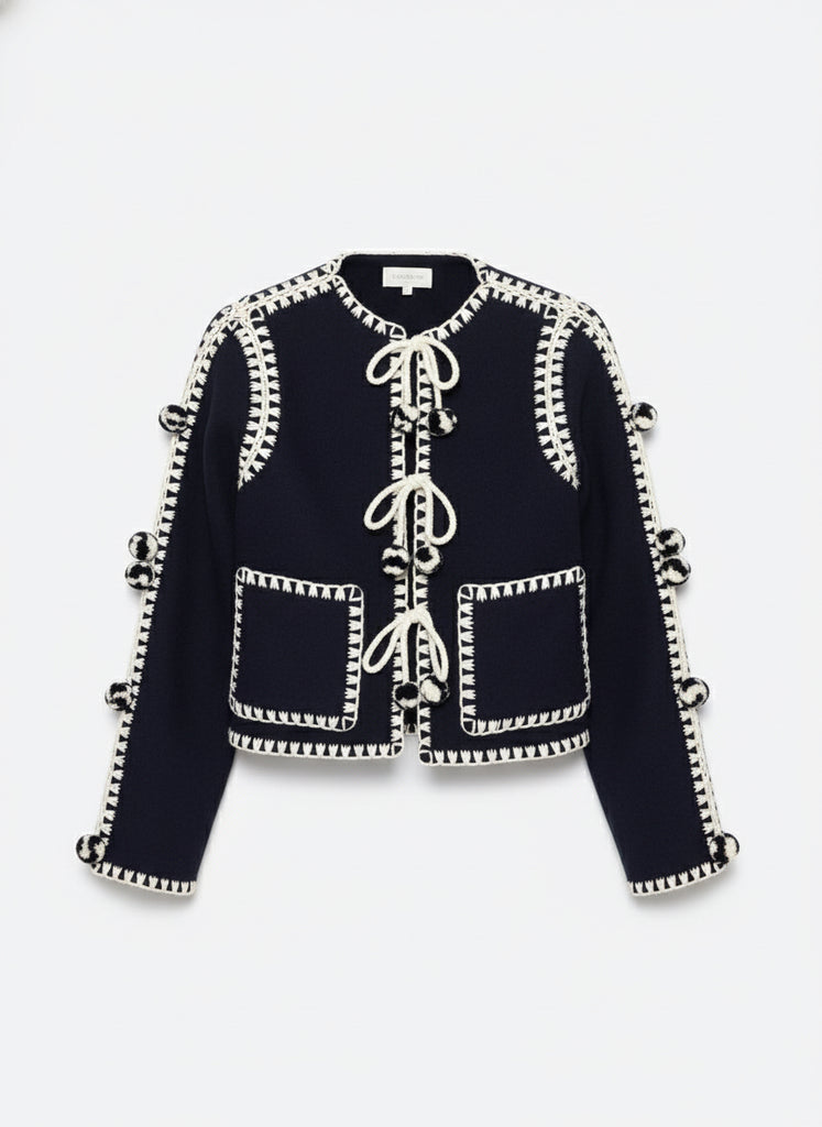The Addison pom pom jacket blends whimsical pom pom accents with intricate crochet detailing, creating a playful yet polished outerwear piece. With a cropped silhouette and front tie closures, it offers a modern twist on vintage charm.