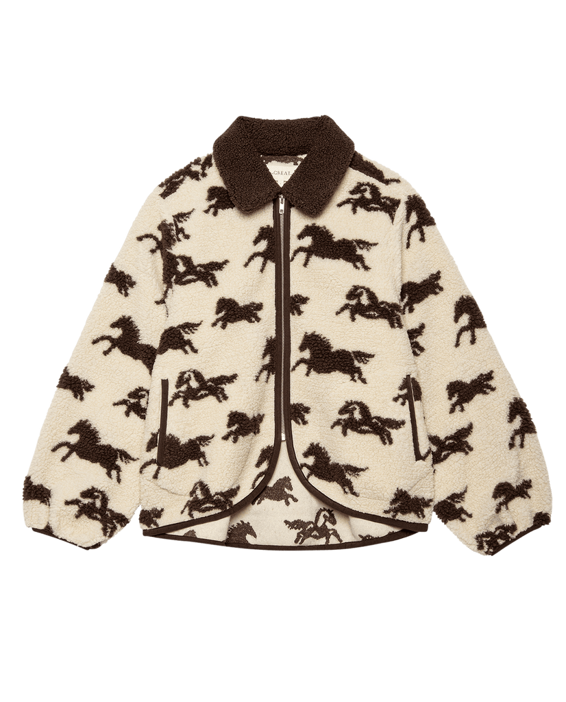 The Pasture Jacket. is ready for outdoor adventures. The relaxed zip-up jacket is crafted from a plush fabric and tells the story of wild horses running across a meadow. Distinguishing characteristics include a charming shirttail hemline, contrast stretch binding around the edges, a fluffy plush collar, billowy sleeves, and welt pockets in an earthy brown that pairs with everything in your closet.