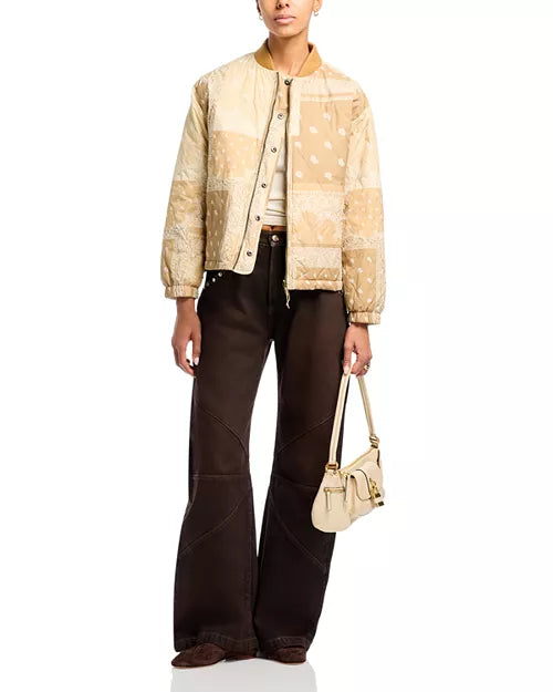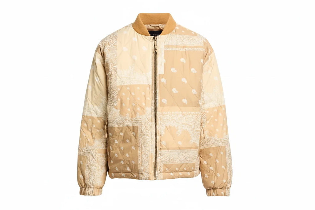The Quilted Puffer revisits a classic bomber silhouette, cut in the season’s Bandana Print—a longstanding motif within the collection. The style features A Bomber collar, Long sleeves, Front zip closure with rubber-coated snap overlay.