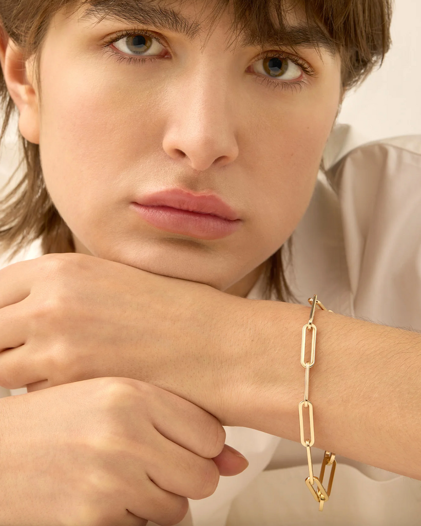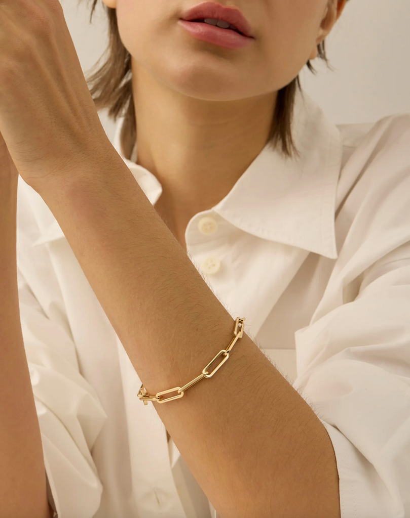 A modern paperclip chain bracelet with a crisp silhouette and lean links. This design includes non-removable extender rings and a custom ball closure, making it easy to adjust to your ideal length. Finished in high-polish gold.