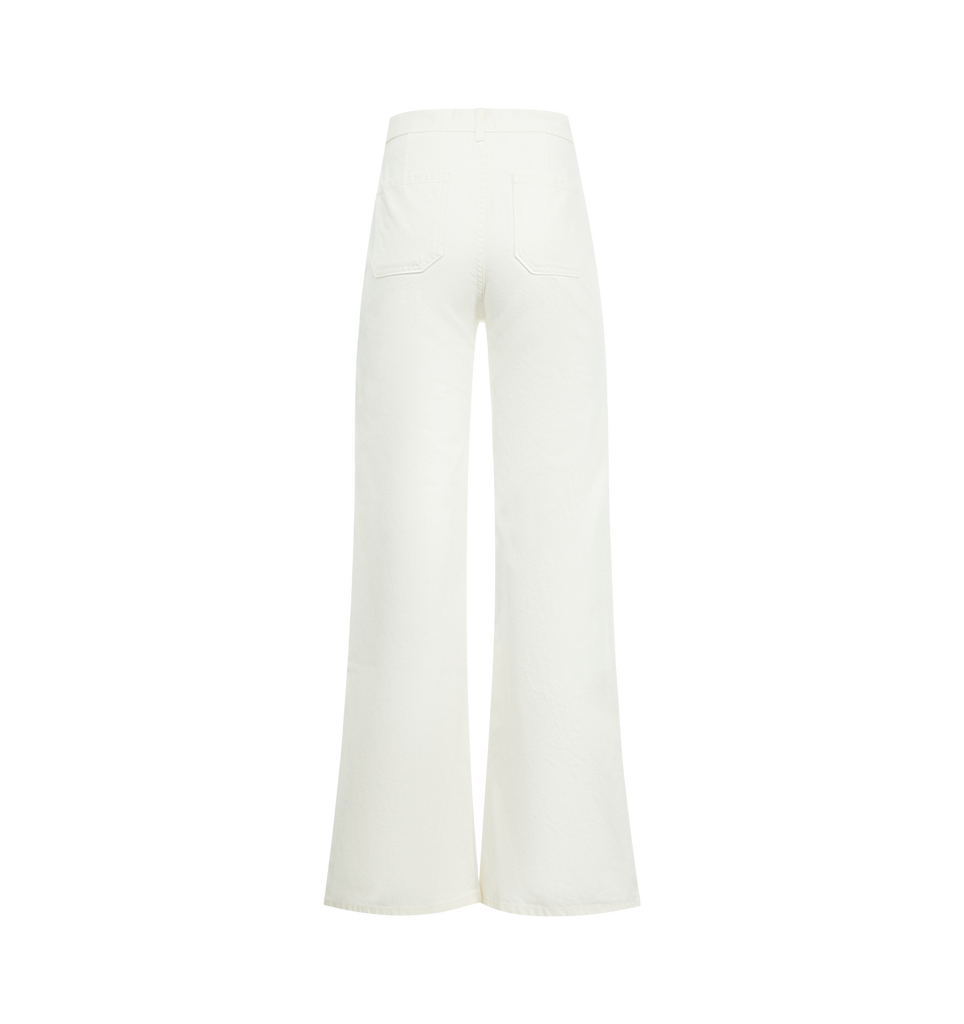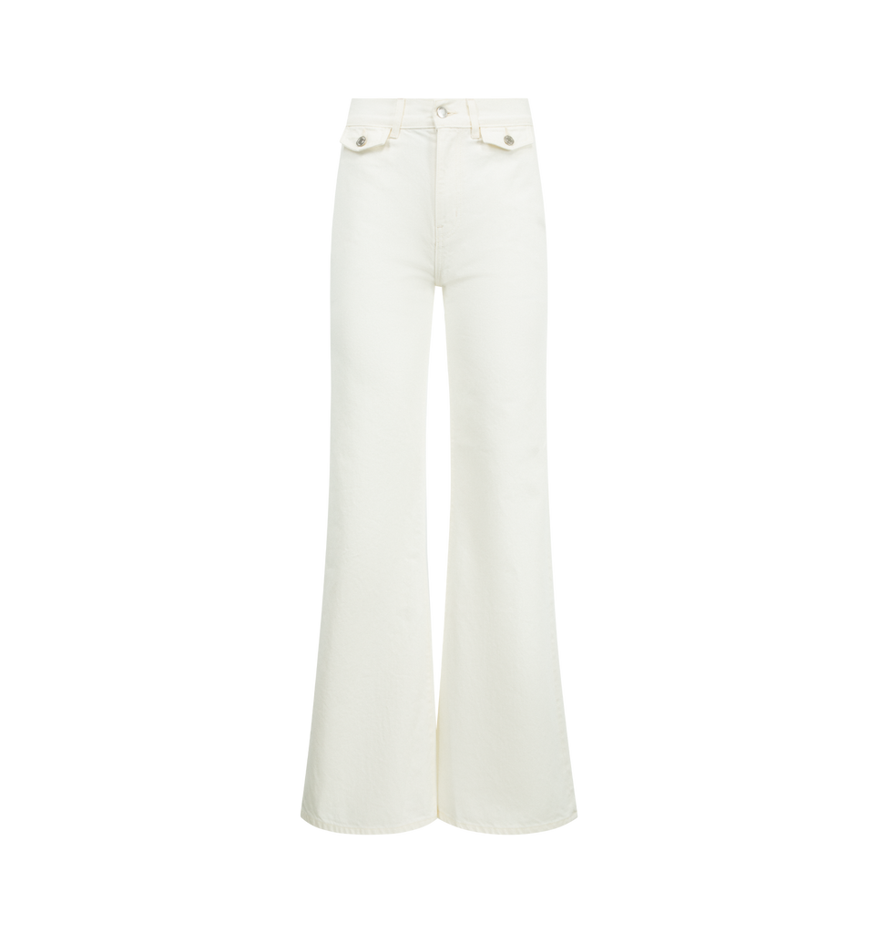 High-rise  flare leg jean in Japanese non-stretch denim. Front shank pocket detail. Back patch pockets with darting. Belt loops.
