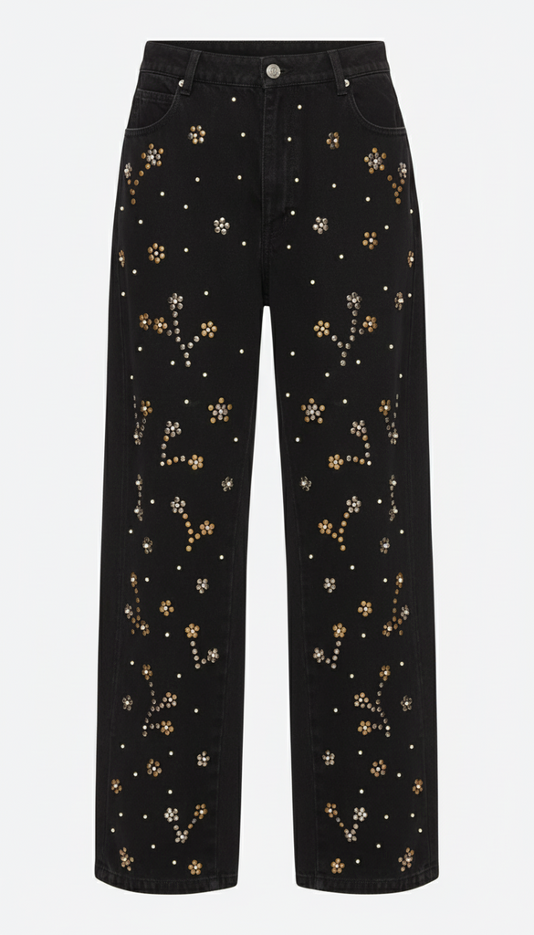 The Etta studded denim jeans are adorned with intricate pearl beading and metallic studs arranged in a bold floral pattern. This thoughtful embellishment brings texture and artistry to a classic silhouette.