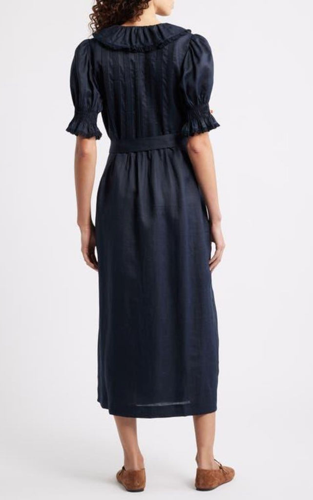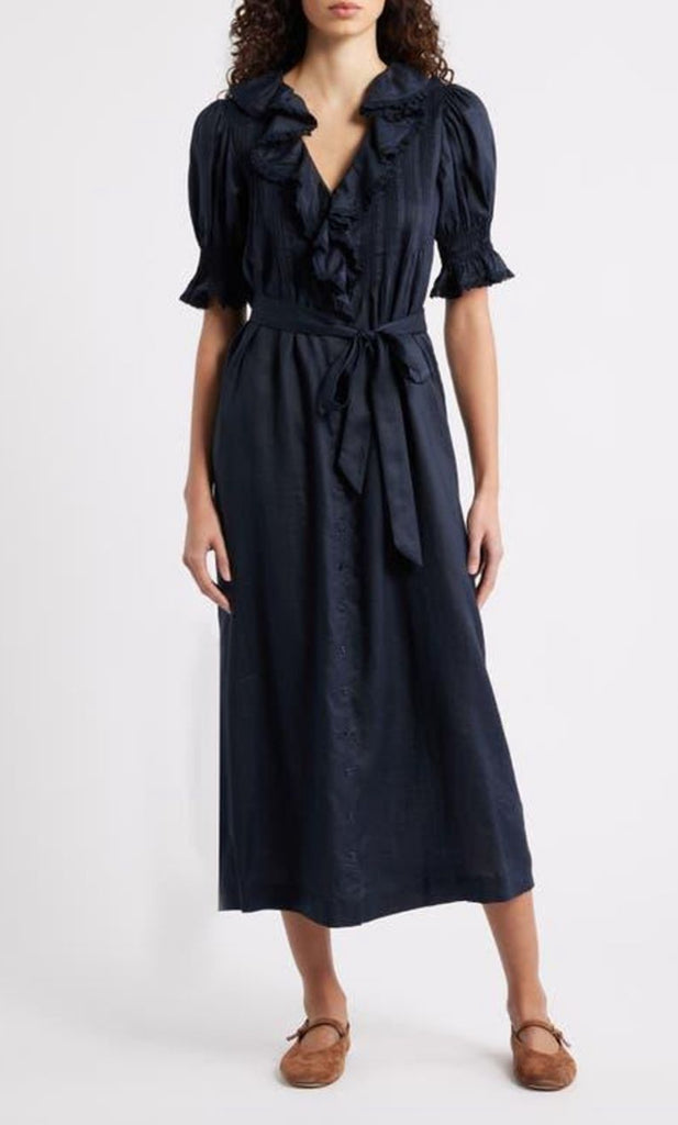 If you are going to have One Doen dress in your closet.... this is THE ONE. A perfect blend of sexy and sweet, a cascade of ruffles, crisp pintucks and playful puff sleeves. This midi dress has a sense of movement and charm. Outlined with lace trim and hugged by a removable belt, it transitions seamlessly from polished days to carefree nights.