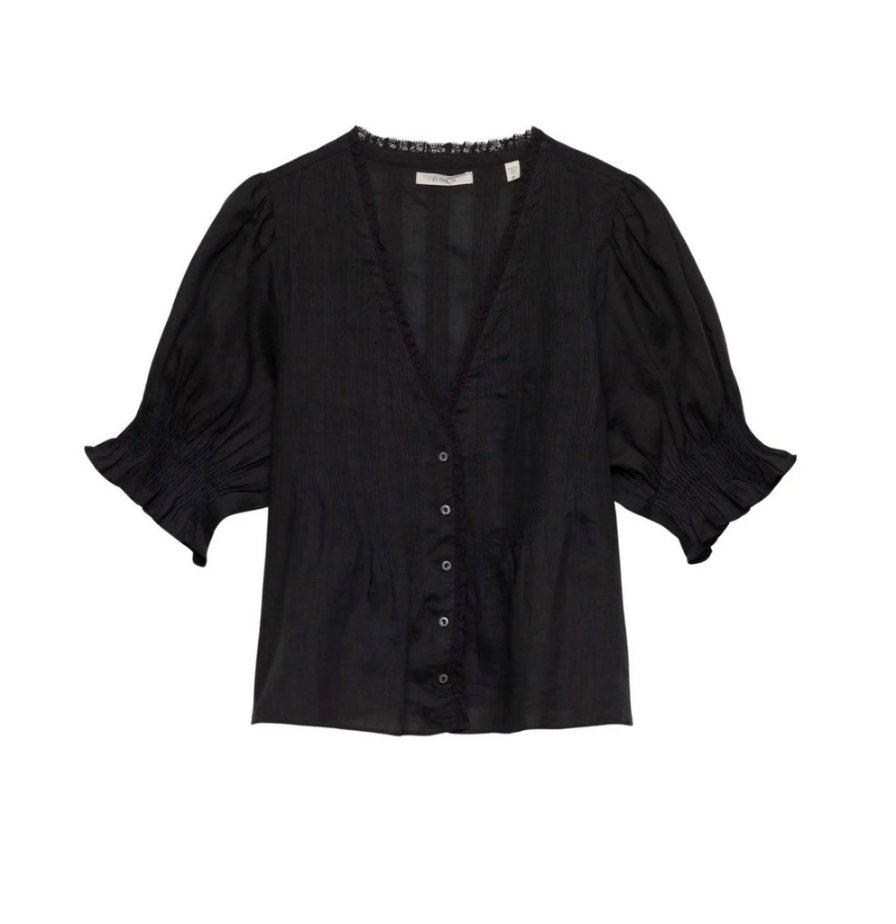 The DOEN Karlie Top featuring a Vneck, button front with delicate pintucking, ruffle and lace detailing and elbow sleeves.