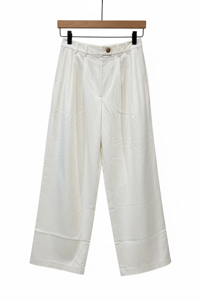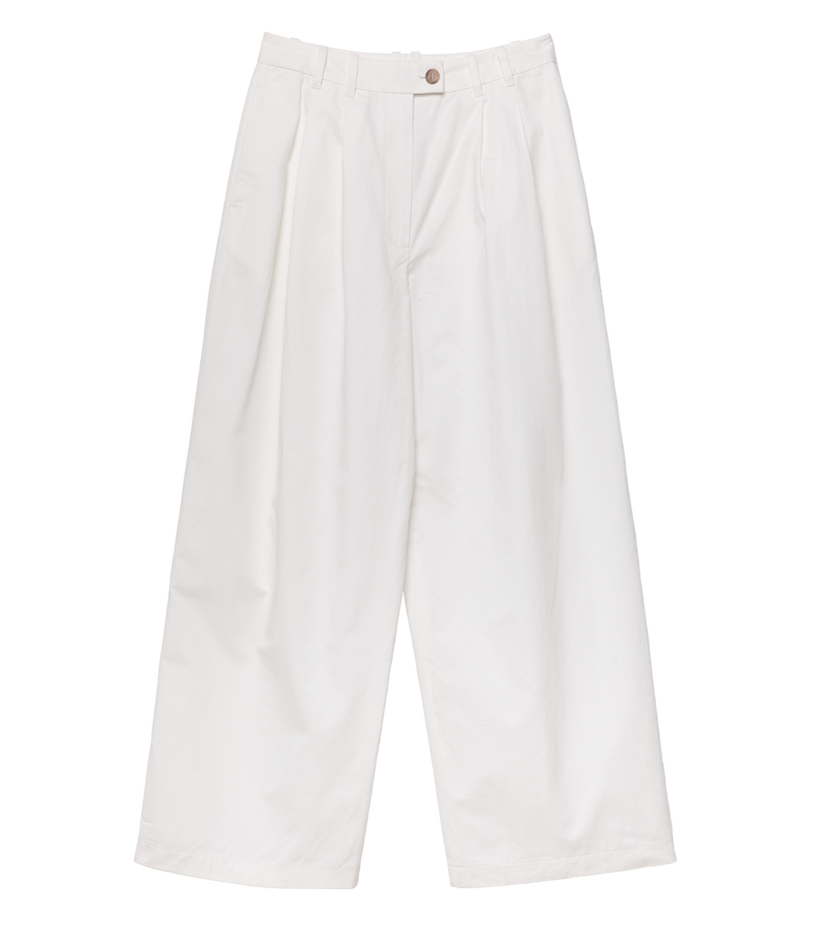 Crafted in a structured cotton twill, the Lisa Pant—a fast favorite of our co-founder Katherine—takes cues from ‘40s tailoring. It features an ultra-high waist, a wide-leg with pleats for ease, side seam pockets, and two welt pockets at the back. A faux horn button and hidden zipper closure fasten at one side.