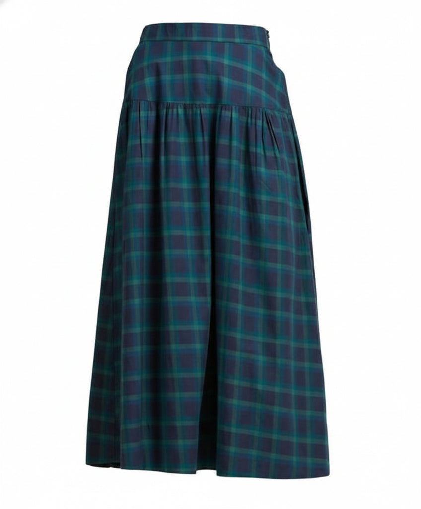 The Lydia Skirt is a full length skirt with a smooth waistband and a flattering hip panel with seamed gathers at the hips, which release into a sweeping hemline. Side seam elastic provides a comfortable and flexible fit. Featuring our signature side seam pockets. Shown here in Windsor Plaid and made from our viscose cotton.