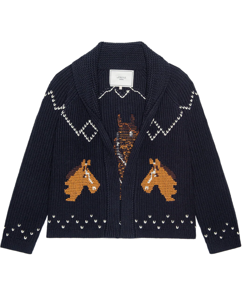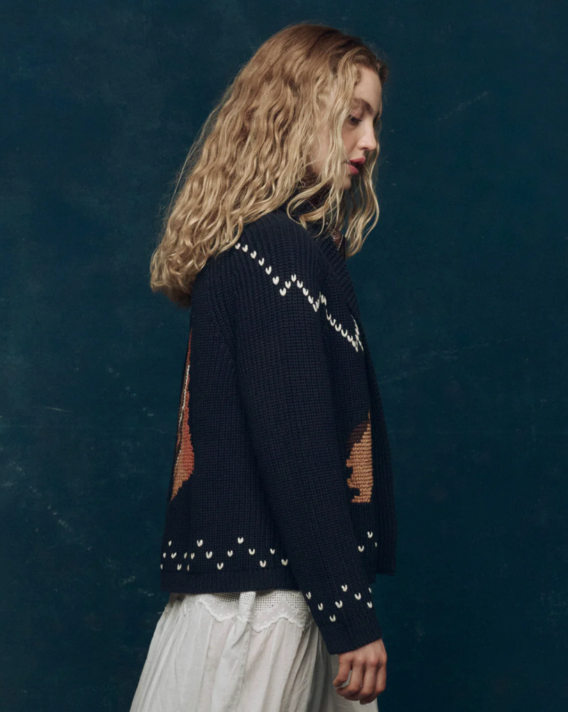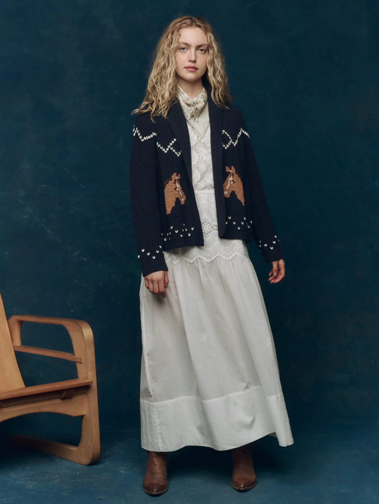 Inspired by a beloved 1960s children’s sweater, The Horse Lodge Cardigan brings a sense of western nostalgia to our best-selling Lodge silhouette. Hand-embroidered horses add a charming, heritage touch, while a soft cotton-blend yarn keeps the feel easy and wearable. Designed with intentional ease through the body, it layers effortlessly for everyday comfort. Size down for a closer fit, or wear true for that relaxed, borrowed-from-the-past feel.