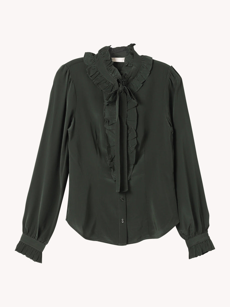 The Catroux Blouse is adorned with 19th century-inspired French florals enriched with graphic engravings. Crafted from signature silk crepe de chine, this silk top is imbued with poetic detailing, with frills at the collar and fluted cuffs.