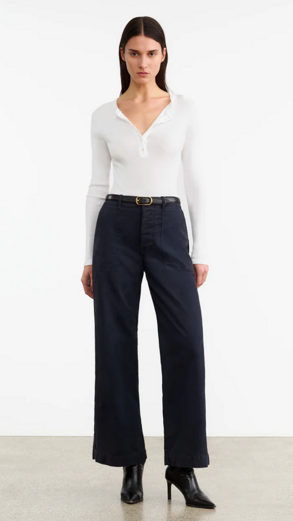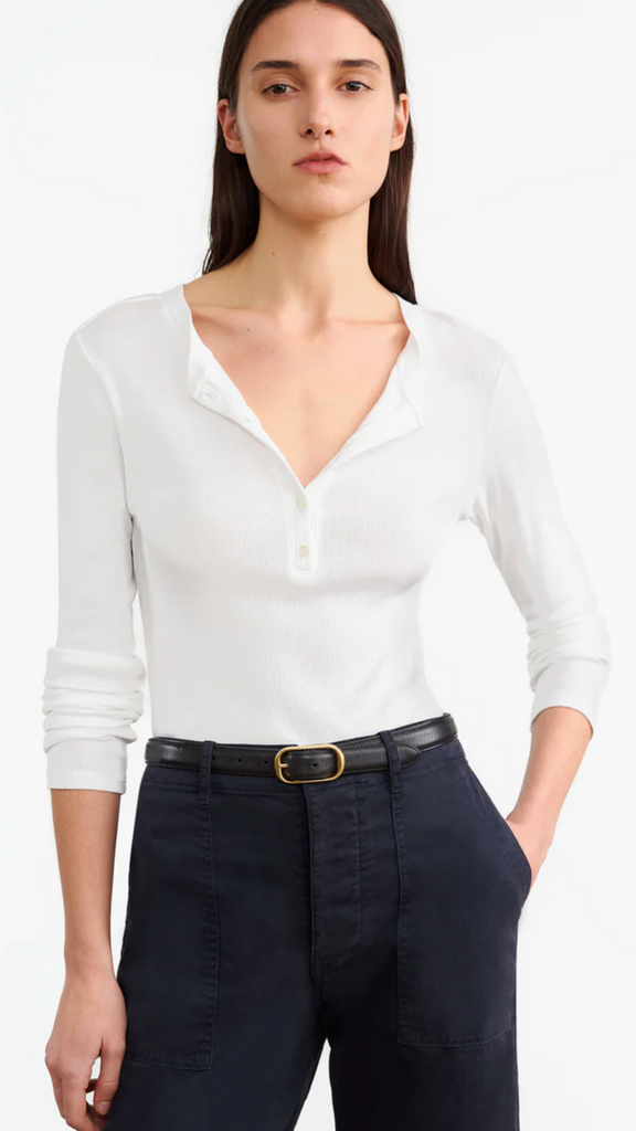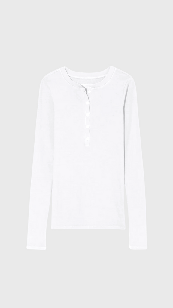 The Nili Lotan Jordan Henley Tee is a timeless staple with a refined, minimalist edge. Crafted from soft cotton rib, this slim-fit long-sleeve tee features a five-button front and a sleek, self-trimmed neckline and placket. Perfect for layering or wearing solo, it’s an effortless essential that pairs seamlessly with everything from denim to tailored separates.