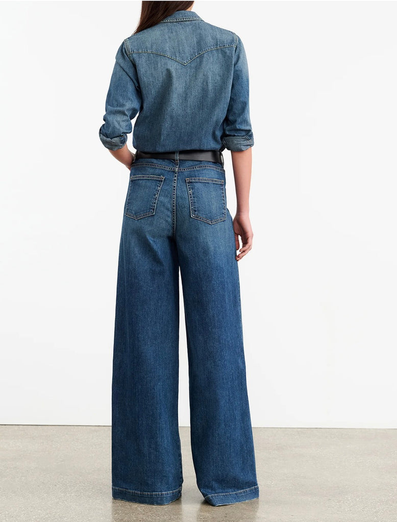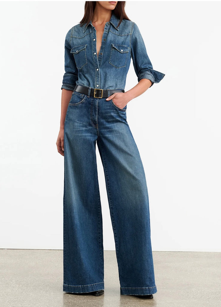 Classic, straight fit collared jean shirt in Japanese denim. Western details. Pearl snap buttons. Chest flap pockets. Standard placket. Center front buttons. Buttons at cuff.