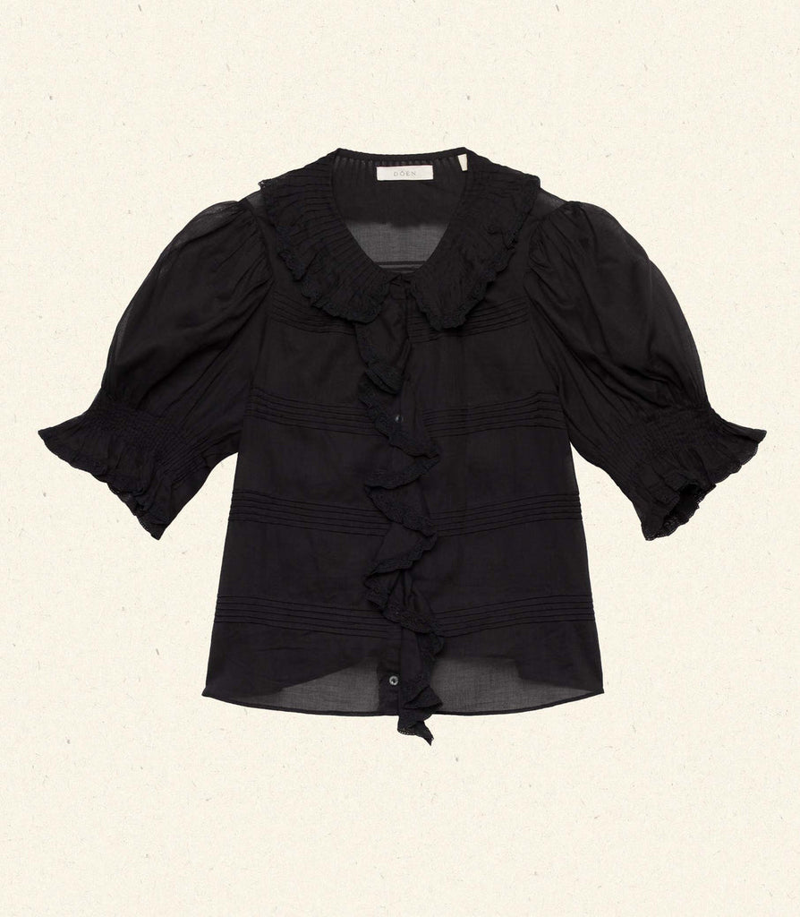 In the softest organic cotton voile, the Balsam Top features a Peter Pan collar and short puffed sleeves adorned with pintucks. Horizontal clustered pintucks lend texture to the slightly cropped bodice, while mother-of-pearl buttons extend down the front. The collar and sleeve cuffs are trimmed with scallop-edged lace.