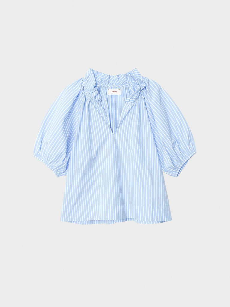 Clementine is new this season in our crisp paper poplin with a refined feel. Clementine is a femme blouse featuring a deep V-neck with ruffle detailing and shirred puff sleeves.