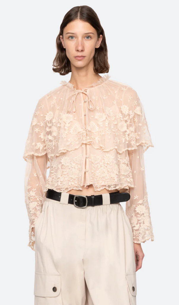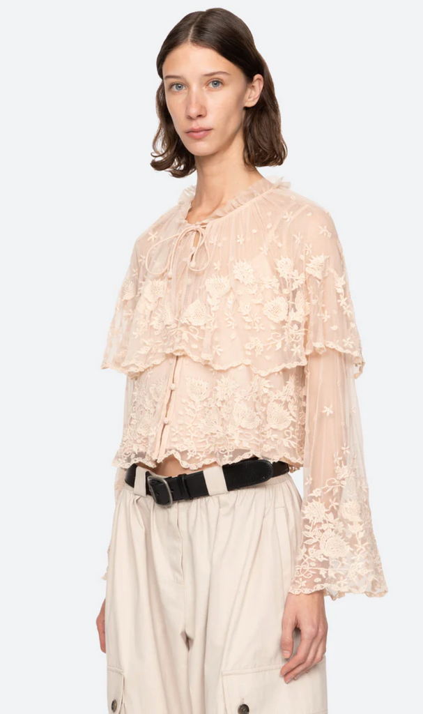 The Bronte embroidered top is crafted from sheer, embroidered mesh and features a romantic capelet overlay, long flowing sleeves, and a front tie closure. Its airy silhouette and intricate floral detailing evoke ethereal, feminine charm.