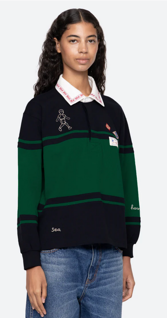 • The Carolyn long sleeve rugby shirt is a workwear-inspired rugby top featuring long puff sleeves, custom Sea labels, and intricate embroidered detailing. Designed with a button-front closure, this versatile piece blends utility with feminine charm, making it a unique addition to any wardrobe.