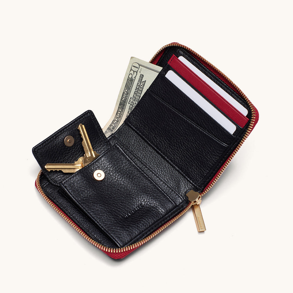 The perfect everyday wallet that fits inside all of your favorite styles featuring Hammitt's signature combo of black leather, brushed gold hardware and a red zipper pull. This compact carry-all has dedicated spaces for cards and bills, plus a secret expandable pocket that's ideal for loose keys or a chapstick.