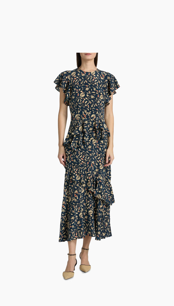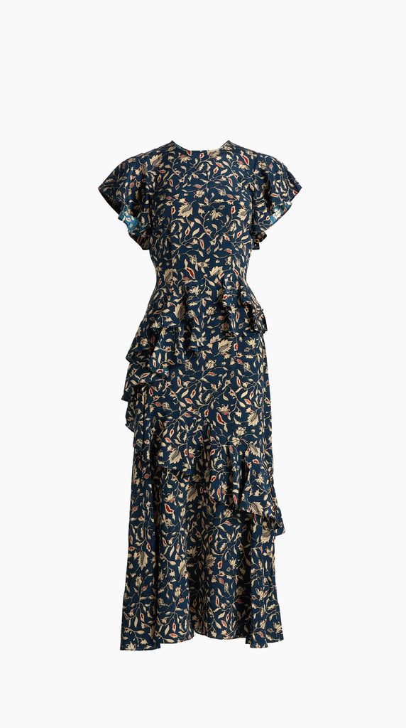 This Amaia dress from Ulla Johnson is crafted of silk and features a printed design with cascading ruffles.