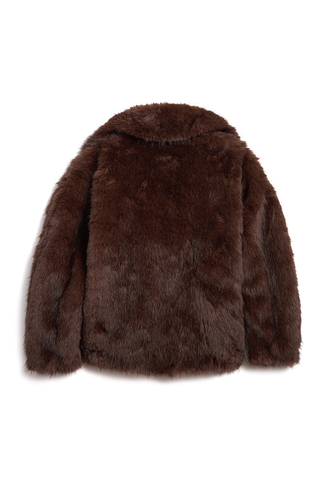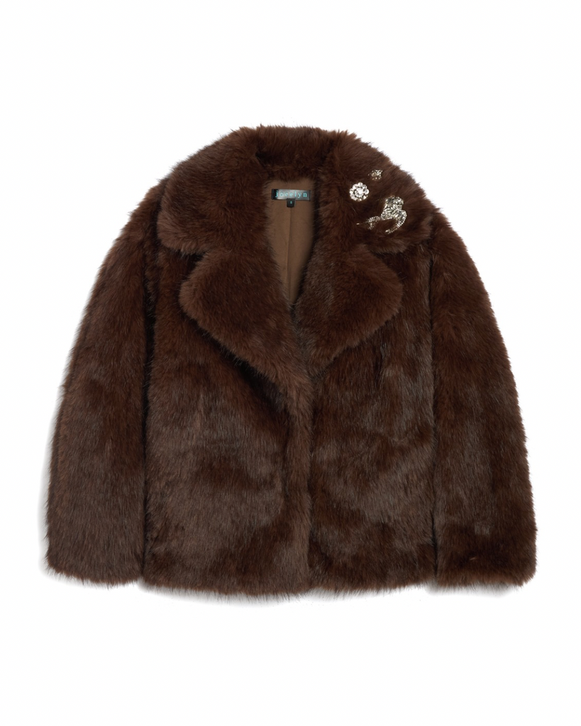 Mysterious, sophisticated and refined, this chocolate faux fur coat is a new classic. Featuring a beautiful Crystal-embellished clip adding just the right amount of intrigue, while its plush texture keeps you discreetly warm. A new essential coat from Jocelyn.