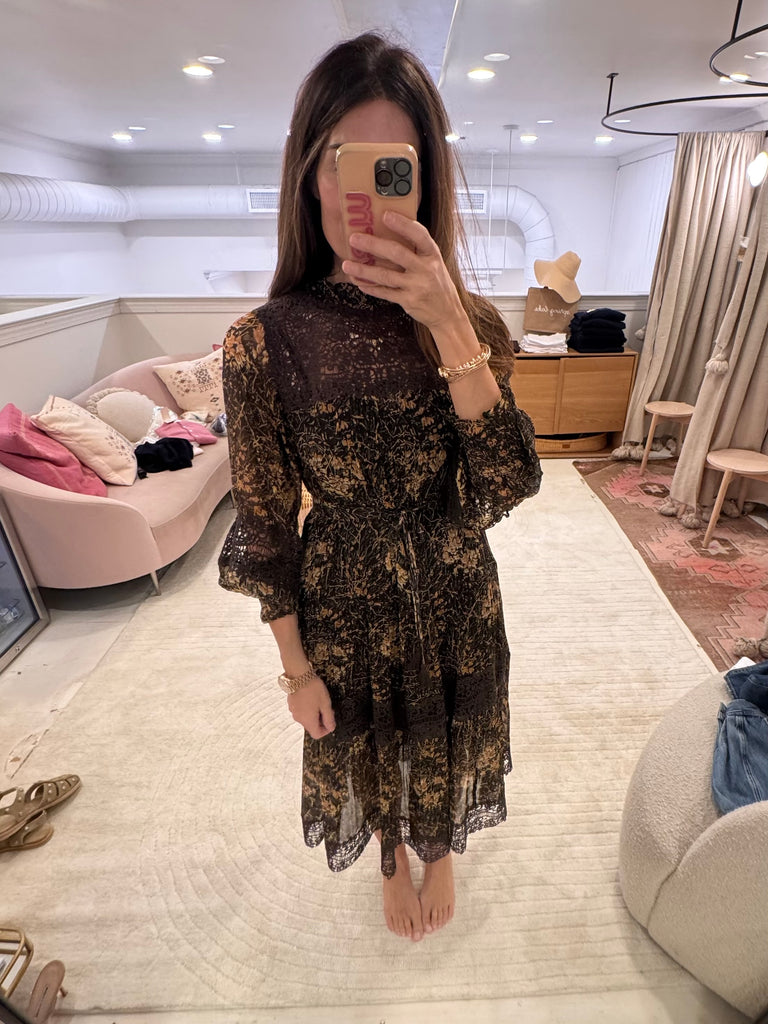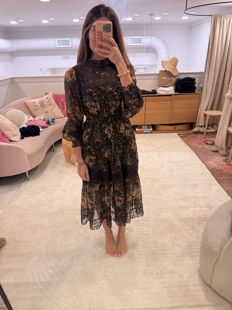The Luisa floral print dress in brown features long sleeves and intricate floral embroidery throughout. The delicate floral print complements its maxi silhouette for an effortlessly feminine look.
