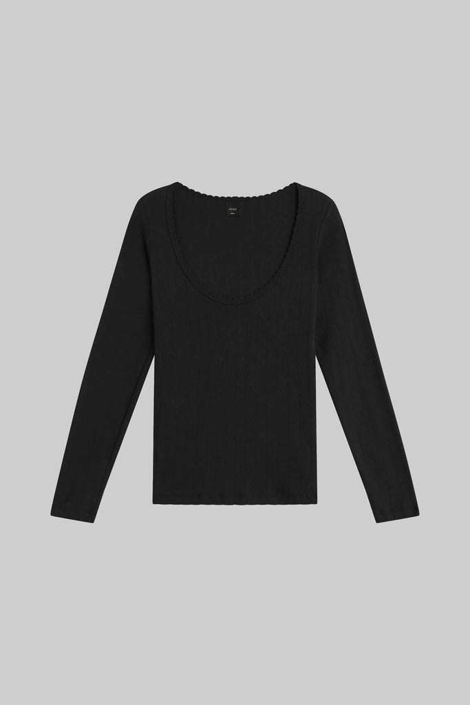 Cut in our nostalgic Pointelle Cotton, The Pointelle Slim Fit Long Sleeve features a flattering scoop neckline with our signature pinhole stripes, dainty eyelets, and scalloped edging. Full length with fitted long sleeves.