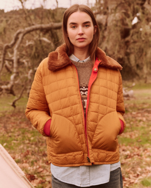 The reversible down logger puffer with a fur trimmed collar. Poppy & amber 100% nylon with down fill